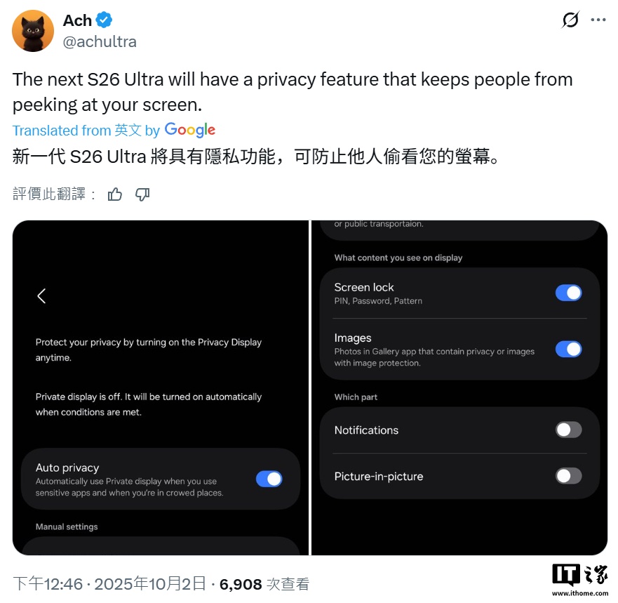 IT之家 10 月 2 日消息,消息人士 Ach 今天在 X 平台透露股票配资平,三星 Galaxy S26 Ultra 手机将拥有全新隐私防护功能,可在公众场合中自动开启。