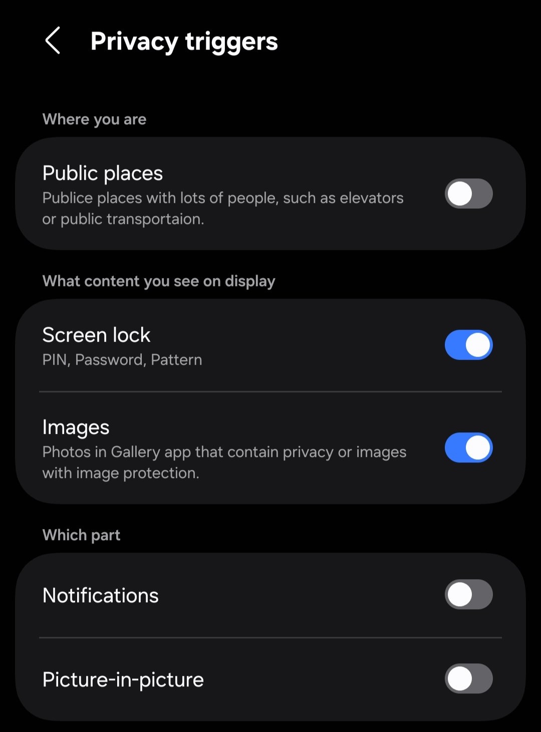 根据消息人士放出的截图,这项功能可以在电梯、公交 / 地铁等公共交通工具或其他人流密集的公共场合中自动开启,能够阻止其他人偷偷看向使用者的手机屏幕,防止窥屏,保护使用者的隐私。