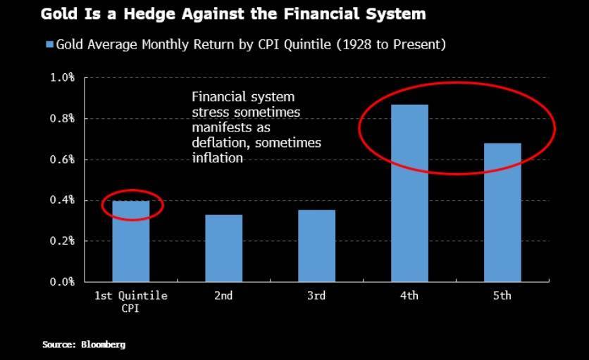 如果按照传统看法,黄金只是通胀对冲工具,那么上图中的柱线应当从左往右逐步变高,因为更高的通胀理应使黄金带来更好的回报。但事实相反:当通胀非常低以及非常高时,黄金的表现都最好。