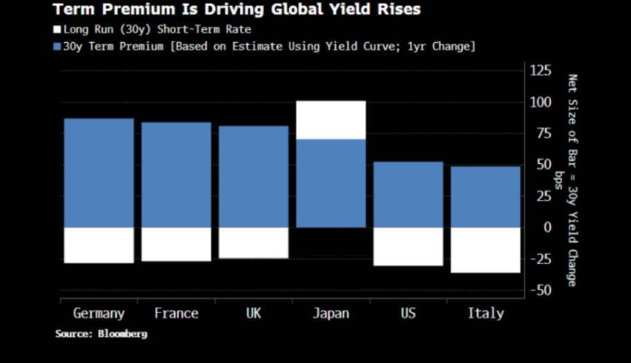 对官方抵押品信心的减弱,可以从期限溢价的上升中看出端倪。在多数主要发达市场国家,期限溢价推动了过去一年收益率的上行。