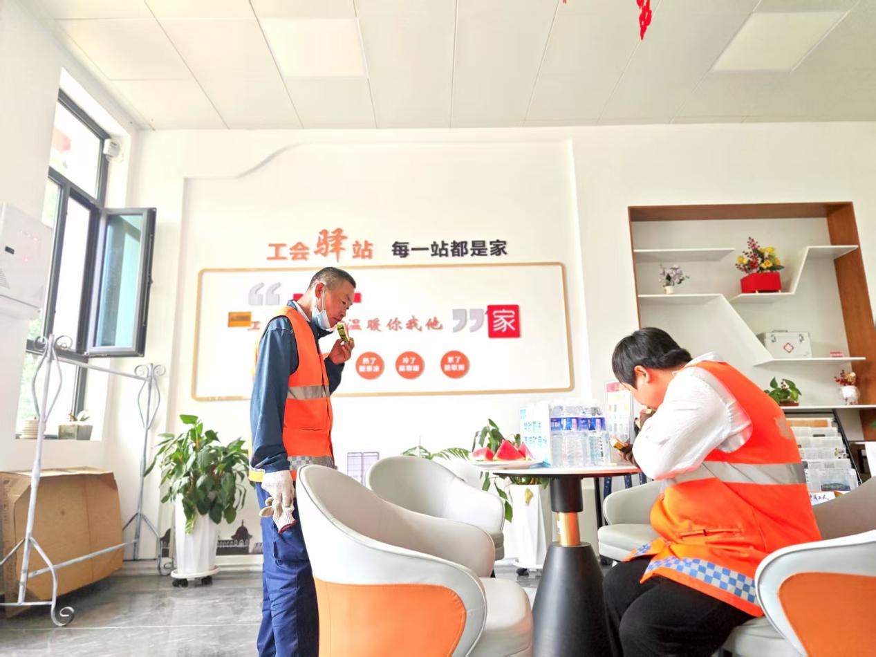 突出精准化服务,传递工会暖温度。驿站不仅提供休息、饮水、餐食加热等基础服务,还会在夏季送上绿豆汤、防晒用品,冬季备好暖手宝、驱寒姜茶,节日里免费供应腊八粥、饺子。